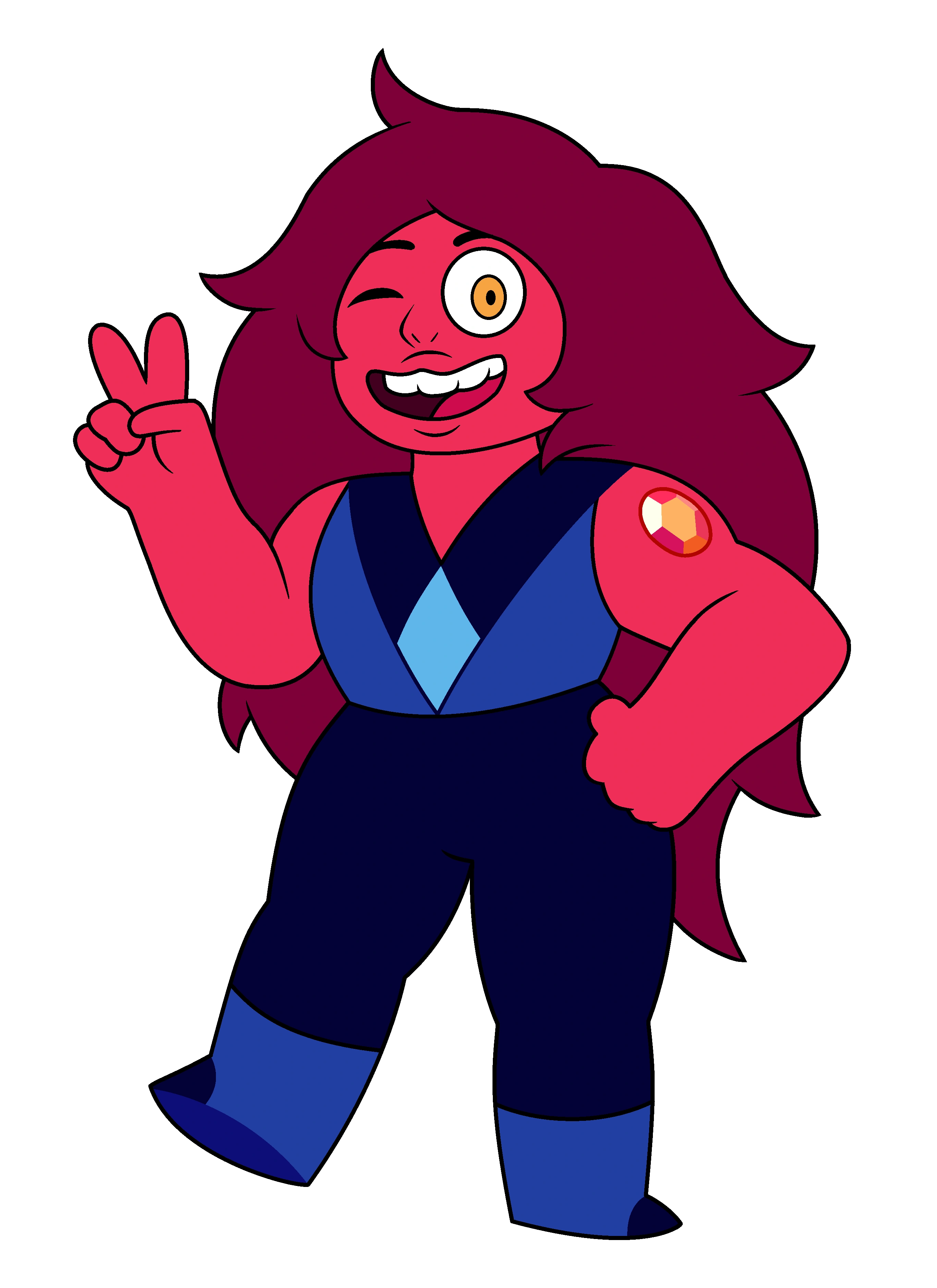 Carnelian has bright scarlet skin, darkish-maroon hair, and peachy-orange eyes. She also possesses spaced, crowded teeth uncharacteristic of any other gem. Another notable trait is her catlike lips, just like the Crystal Gems' Amethyst, whom she boasts a slight height advantage over. A defective Quartz soldier from the Beta Kindergarten, she, like the Crystal Gems' Amethyst, is smaller than she should be (albeit slightly taller than Amethyst).