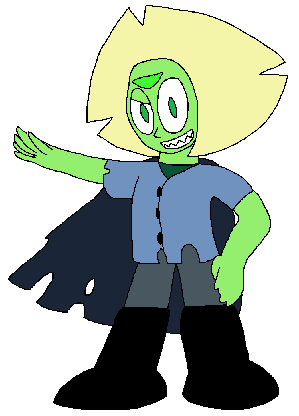 As she is the oldest of the Peridots, and the leader of an entire colony, Chief has a more level head, a leader-like demeanor towards her fellow Peridots, and most other Gems. Despite her age, she still holds some of the cheeky behavior Peridot usually presents, though it's not as common of a sight. She does have a care towards her fellow sisters, claiming she rather not risk going back to Homeworld to keep the others safe from the Diamonds, who sentenced most of them to be harvested in the first place.