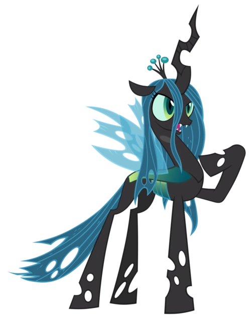 Chrysalis has shown to he the largest of the Changelings, a body design similar to that of Celestia. Her mane is smooth and sea-green, resembling seaweed, and her eyes similar to a reptile. Her legs, wings, and horn were holed, much like other changelings.
