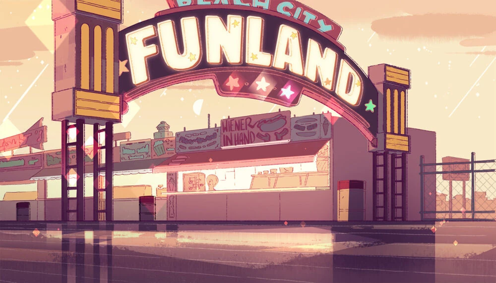 Funland is an amusement park. It features roller coasters, an arcade, a midway, a teacup ride, a ferris wheel, a carousel and bumper cars.