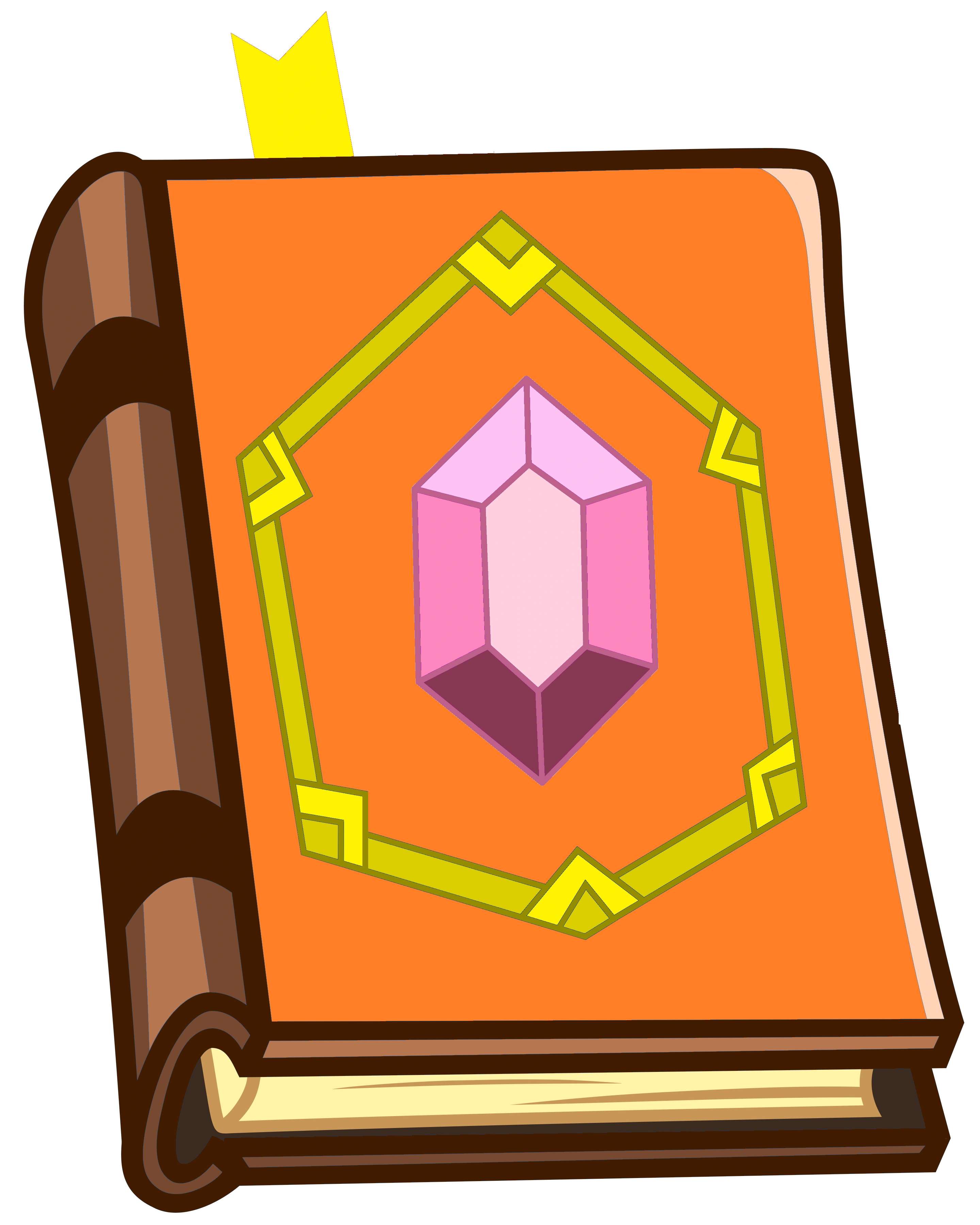 It is a thick, vintage leather-bound book with an orange cover, and a pinkish gemstone centered on the front cover with gold details surrounding it. There also was a yellow bookmark peeking out of its pages. The book is written in "Gem Glyph". The contents describe numerous details regarding Gem anatomy and biology, including Fusion, creation, and Corruption.