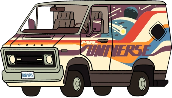 Greg's van appears to be a white mid-1970's Dodge Tradesman with an elaborate custom paint job; an outer-space mural with asteroids, shooting stars, and planets combined with a purple and white "Mr. Universe" logo and red, orange, and blue stripes.