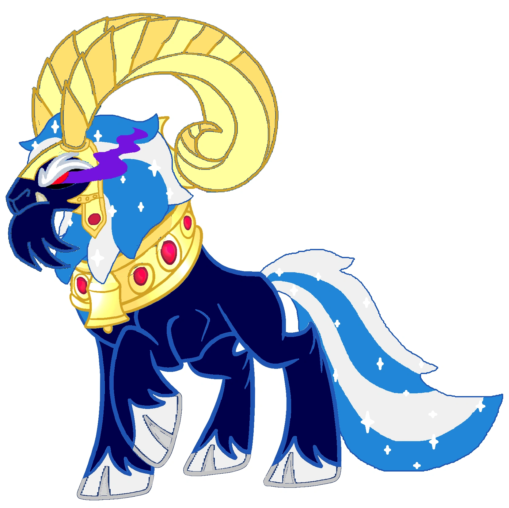 Grogar is a large ram, standing taller than an average pony, but has the face resembling more of a goblin. He has large, sharp teeth jutting out of his bottom jaw, and red eyes with no pupils or irises. He has large curved horns and cloven hooves. Around his neck is a golden bell from his rule in Tambalon, though he does sometimes wear a scarfed medallion to show superiority on occasion.