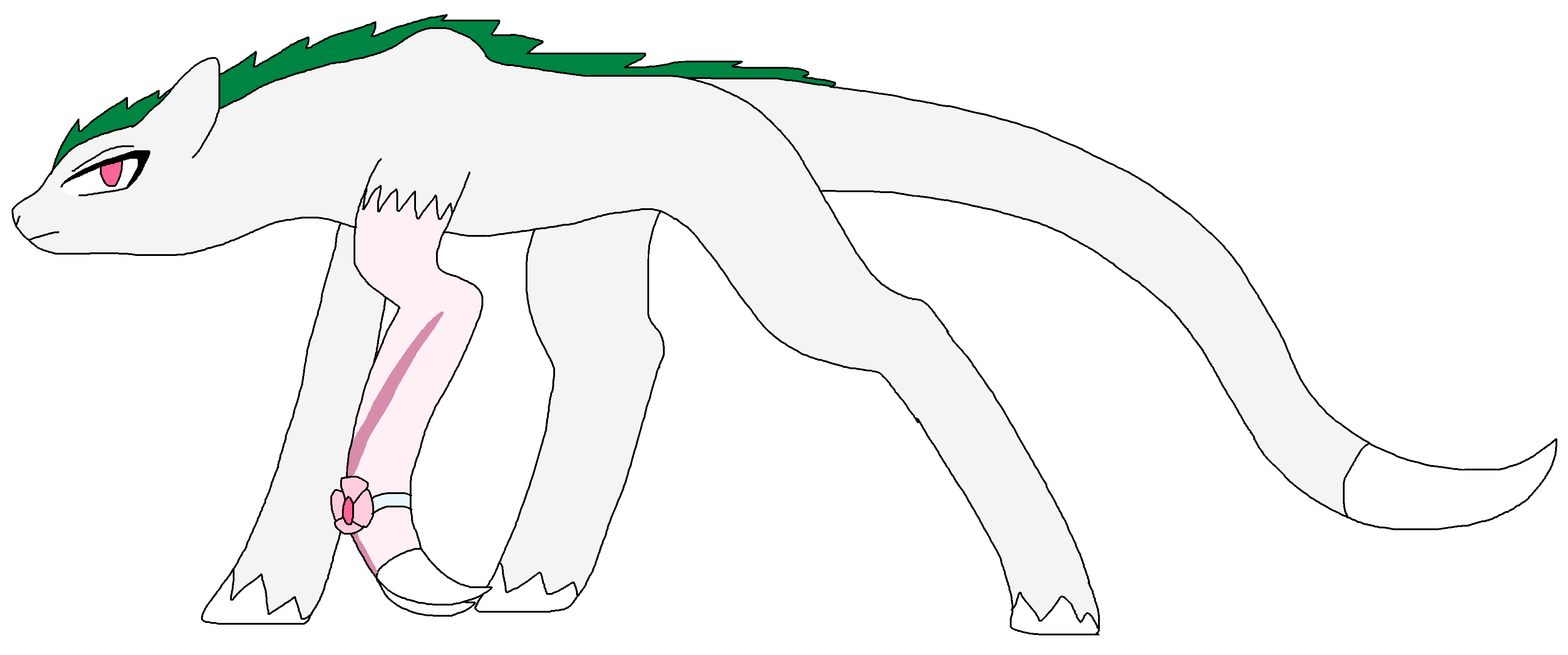 Although he's about as tall as Pearl, making him taller than most ponies, he's considered a runt when compared to his own kind. He has silver white fur with a green mohawk mane going down his neck. He has a long tail, ending in a sharp point, and his eyes are pink. His hooves are cloven, with the exception of his front left leg, which is furless and has a deep cut from his fight with the Diamonds.