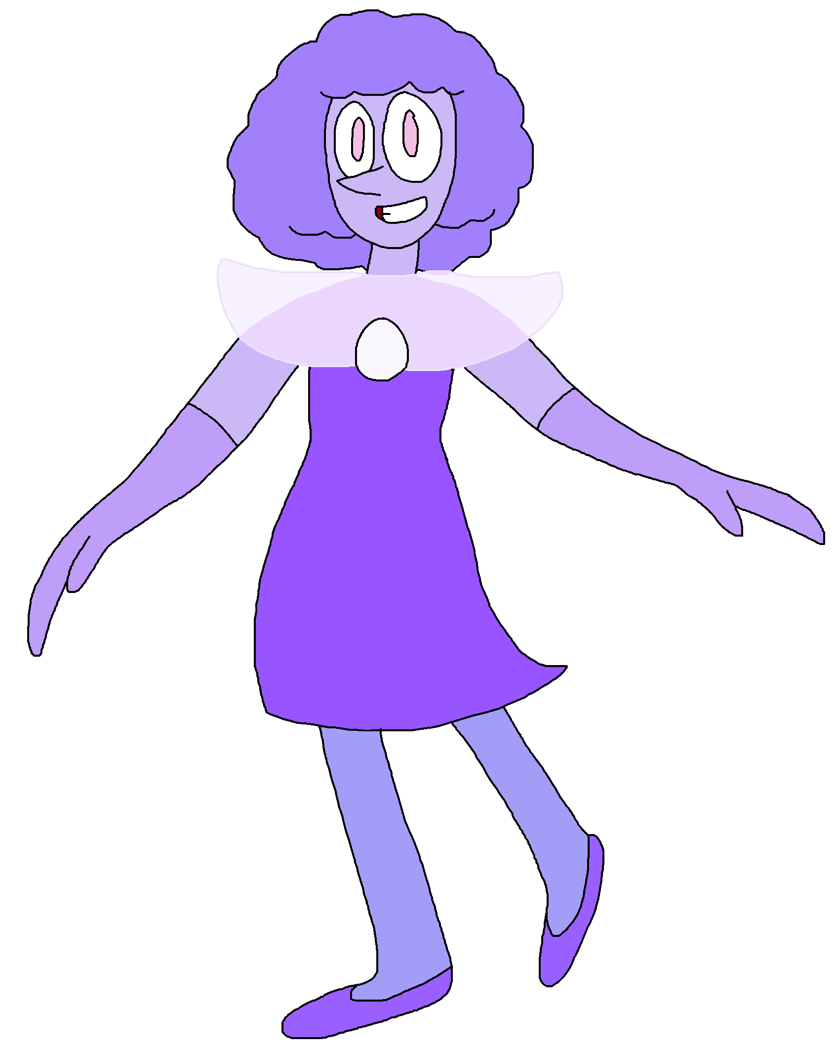Her outfit almost mirrors Yellow Pearl yet with a skirt instead of a body suit, purple gloves, a flair that went around her shoulders and upper chest. Her gemstone is on her chest.