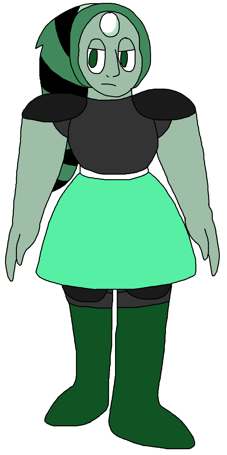 Its body resembled that of a girl but still had the boyish face from Flint. its hair was in a striped ponytail, with striped of black and green bands. Its clothing had black armor from the neck down to Nephrite's chest, with a jade skirt at the bottom of the armor, ending at its knees. She stood at nine feet from head to toe.