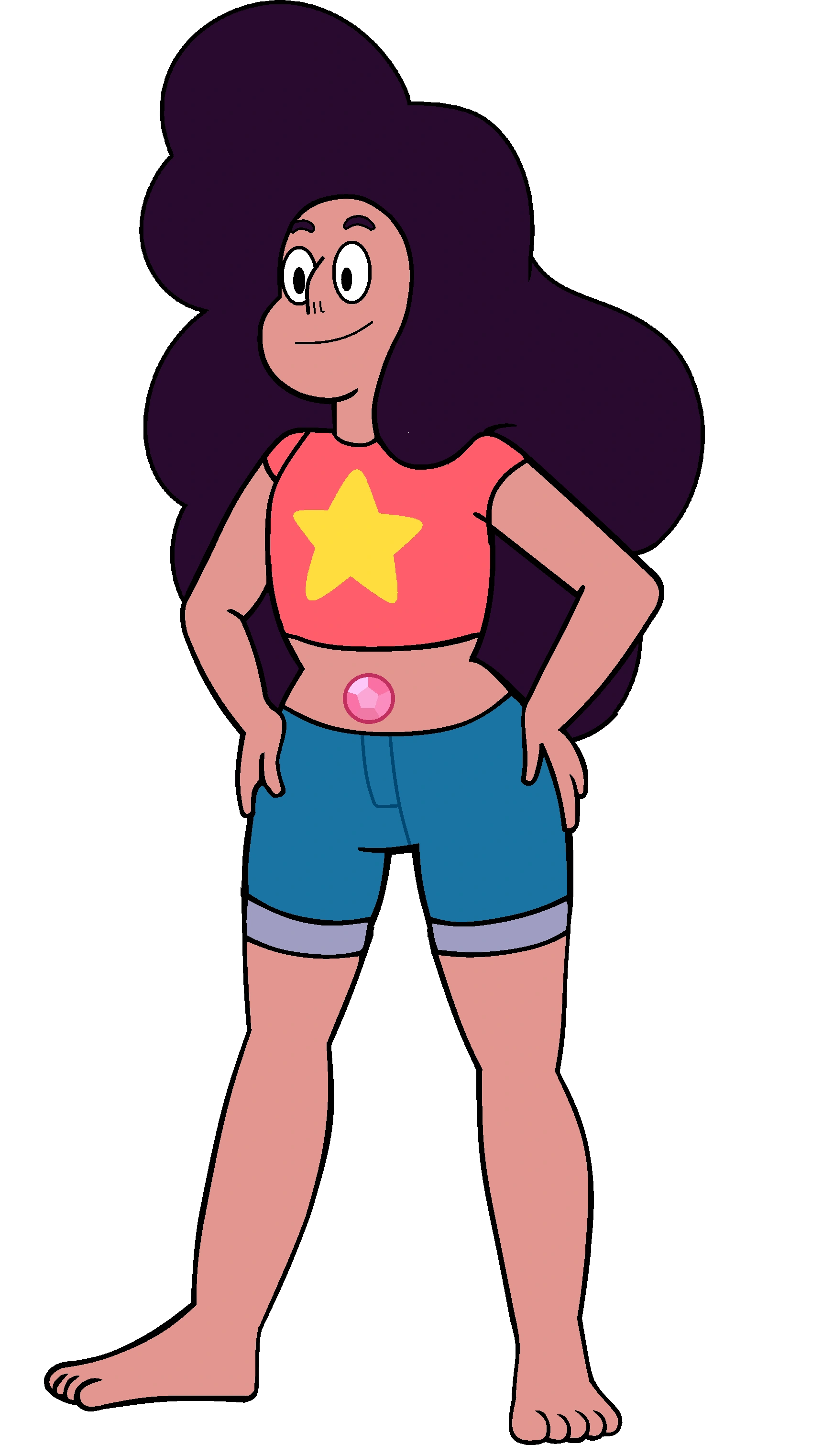 Stevonnie is currently the shortest fusion in the series. They are taller than Amethyst and Pearl but are a few inches shorter than Garnet, matching Flint. They have an average/athletic build consisting of Connie's slim figure with Steven's chubby, stocky features, curly black hair that reaches to their thighs, and a complexion slightly darker than Steven's. Stevonnie is considered to be very physically attractive, as the citizens of Beach City seem to be in awe of their appearance.